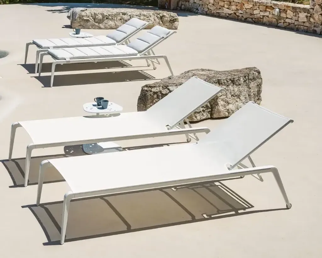 Die moderne Sonnenliege Ushuaia ist ein Muss am Pool oder auf dem frisch gemähten Rasen und verkörpert das perfekte Konzept dessen, was man gemeinhin als "Sommerentspannung" bezeichnet. Das Gestell aus Aluminium ist in allen Fast-Ausführungen und der synthetische Stoff in sieben verschiedenen Farbtönen erhältlich. Ushuaia ist mit Rollen ausgestattet, so dass sie leicht verschoben oder positioniert werden kann. Stapelbar, mit 7-fach verstellbarer Rückenlehne. Kissen auf Anfrage erhältlich.