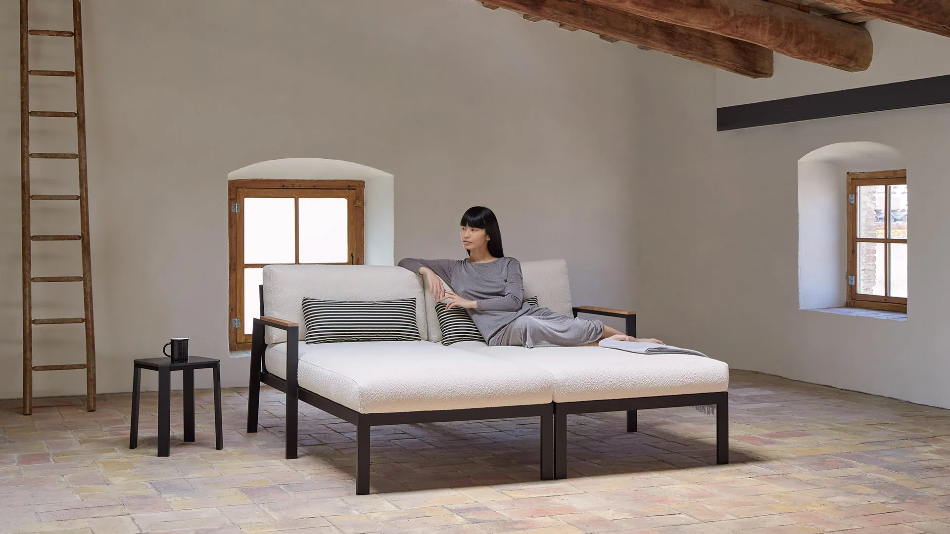 In seiner neuen Outdoor-Kollektion Timeless, die aus der Feder von José A. Gandía-Blasco Canales und Borja García stammt, setzt GANDIABLASCO ganz auf Schlichtheit und zeitlose Eleganz. Die zurückhaltenden und dennoch kraftvollen Formen des Designs sind von der rationalen Architektur des beginnenden 20. Jahrhunderts inspiriert und stehen für eine Ehrlichkeit, der die eigene Struktur Verzierung und Schmuck genug ist. Jedes einzelne Teil der Kollektion ist ein überaus gelungenes Beispiel für minuziöse Ausgewogenheit und maximalen Komfort. TIMELESS entstand als gemeinsames Projekt des Firmeninhabers José A. Gandía-Blasco Canales, der selbst für einige der bekanntesten Kollektionen wie beispielsweise SALER oder die Produktlinie ESPACIOS EXTERIORES verantwortlich zeichnet, und des jungen valenzianischen Designers Borja García, der durch seine Arbeiten im Bereich Industriedesign und Architektur bekannt wurde und auch die Linie RAW von GAN, der Designmarke von GANDIABLASCO für handgefertigte Artikel, entworfen hat. TIMELESS ist vollständig aus Aluminiumguss mit Thermolackierung gefertigt, weshalb die Teile sehr leicht sind und man sie trotz ihrer Größe problemlos transportieren kann. Die Ausführung in Iroko- Holz, einem wetterbeständigen Naturmaterial, ist hervorragend für den Einsatz im Outdoor-Bereich geeignet. Die Aluminiumstrukturen sind in allen Farbtönen der Farbpalette GANDIABLASCO und in einer neuen, speziell für die Kollektion entworfenen Linie erhältlich. Die große Auswahl an Outdoor- Bezügen unterschiedlichster Art macht TIMELESS zu einem ungemein anpassungsfähigen Produkt, das sowohl für den Contract-Bereich als auch für Privathäuser immer elegante Lösungen bietet. Die Kollektion besteht aus fünf modularen Sofas, die vielfache Kombinationen ermöglichen, sowie aus einer Liege, einem modularen Sitzkissen und verschiedenen Sesseltypen (Lehnsessel, niedriger Sessel etc.), einem hohen Tisch und Hockern.