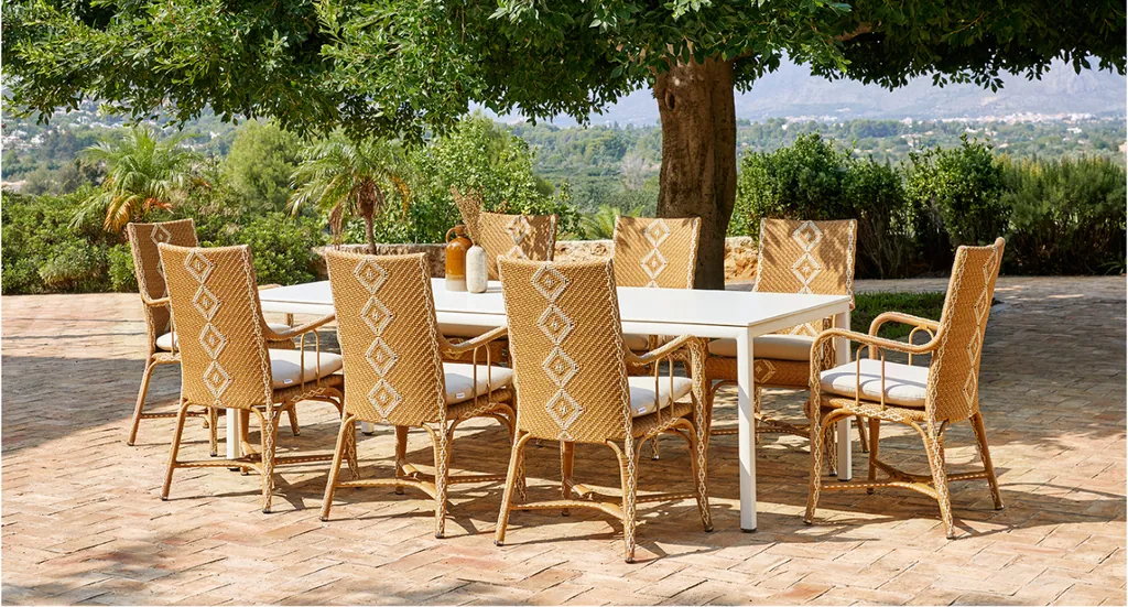 Der Glamour der Kreuzfahrtschiffe der Goldenen 20er Jahre des letzten Jahrhunderts inspiriert dieses von Alfonso Gallego entworfene Stück. „Die größte Herausforderung bei der Kreation dieser gewagten und eleganten Kollektion bestand darin, die Strukturen und den Stoff an die Faser anzupassen, mit der das Stück bezogen ist“, erklärt der Designer. Das Shintotex-Geflecht – eine von POINT entwickelte hochbeständige, recycelbare Faser – erzeugt ein Muster mit Bewegung, mit dem die Aluminiumstruktur bedeckt ist. Charleston ist in Hellbraun erhältlich.